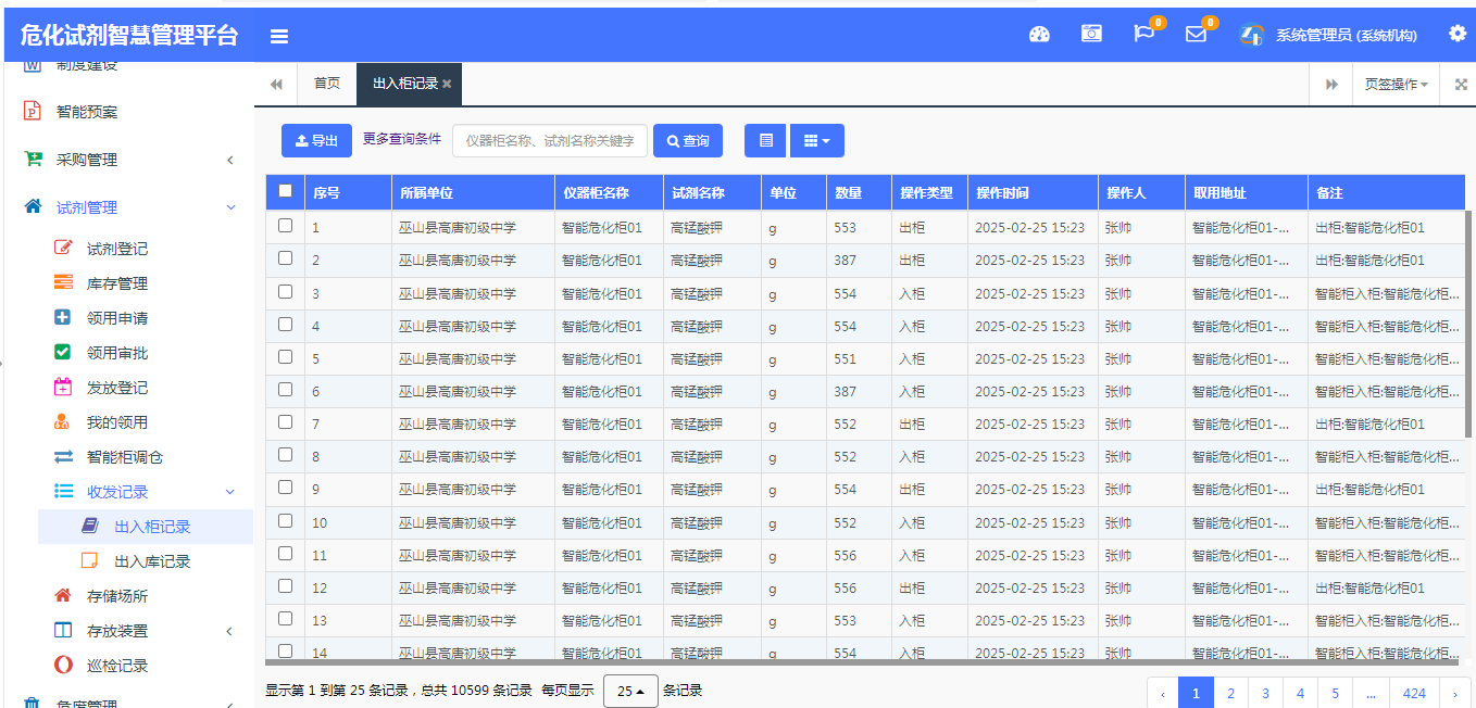 該系統三終端技術裝置通過網絡接入“實驗?;噭┲腔酃芾砭C合應用平臺”聯網運行后,將相關信息實時上報到管理平臺。各類用戶可通過管理平臺對學校實驗?;噭┥曩彙⒋鎯?、收發、使用、廢棄物處置全過程共享應用、實時監管,對異常行為和異常事件聯動處置。